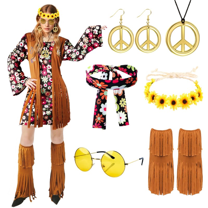 - Hippie costume set: this hippie women's costume set contains a hippie disco hippie women's dress, a pair of leggings with fringes, a hippie headband, a hippie headband, a hippie glasses, a necklace and a pair of earrings. This hippie women's dress will add a hippie flair to your upcoming themed party.