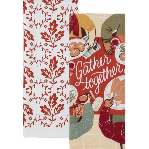 I'm selling SET OF 2 DIFFERENT PRINTED KITCHEN TERRY TOWELS (16.5" x 26") THANKSGIVING DAY FOOD & LEAVES, GATHER TOGETHER as shown on the pictures.