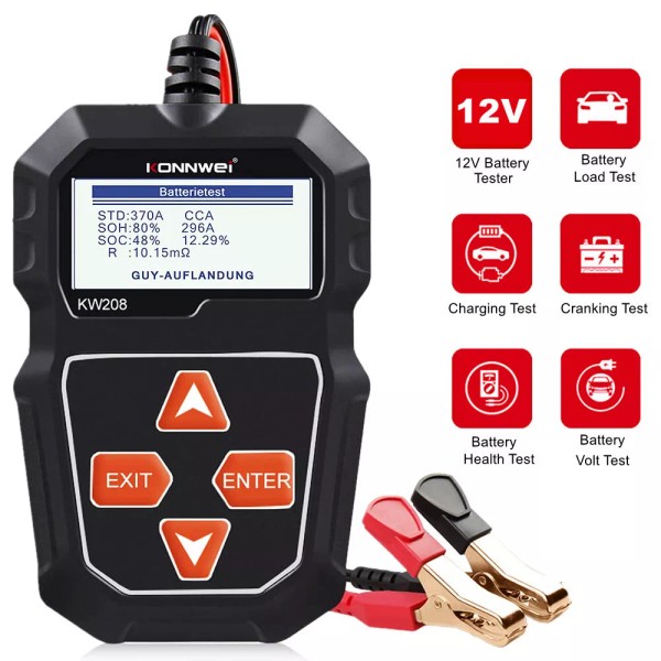 【Display Overall Batteries Data】KW208 12V Battery Load Tester gives you the basic battery parameters such as voltage, internal resistance, cold cranking amp and AH capacity, battery health and charge status. Additionally, battery cca tester will also show you professional advice whether to replace or charge the battery.