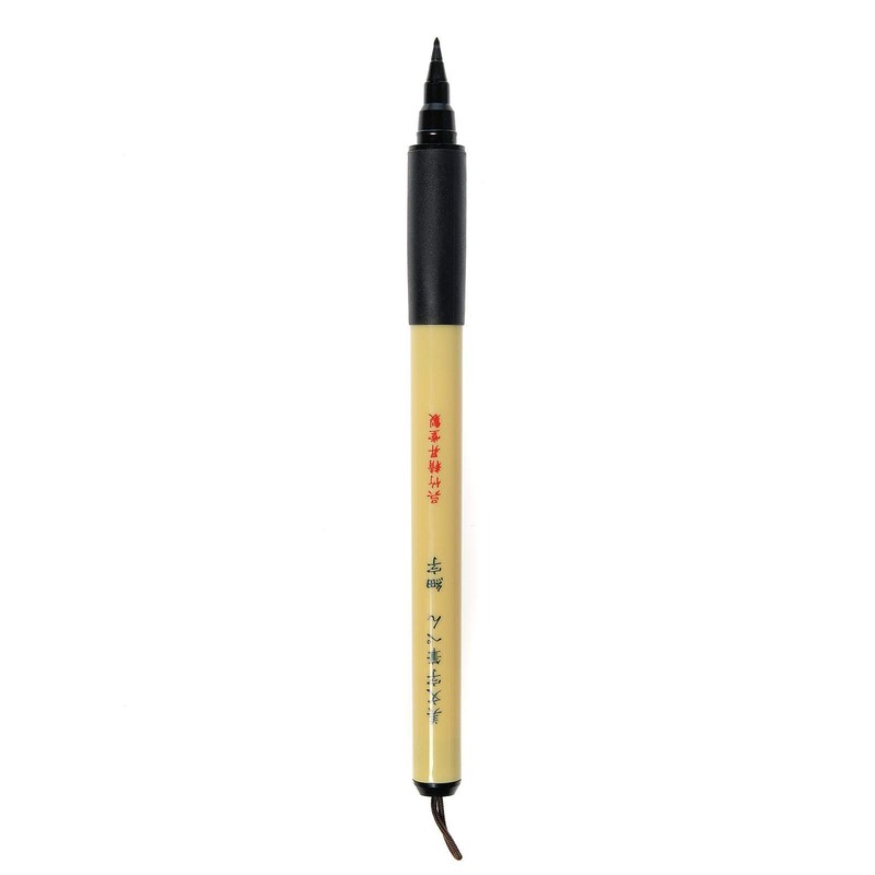 ZIG-Bimoji Fude Pen: Fine. The Bimoji line of pens replicates the look and feel of traditional painting brushes. They feature plastic bodies; black rubber grips; felt tips; black ink; and a hanging loop on the end. The package contains one pen with a Fine tip. Imported.
