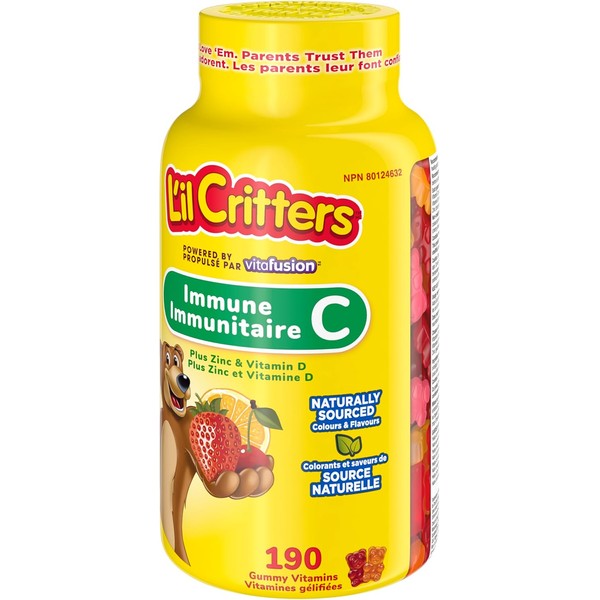 L'il Critters Immune C + Zinc – Tasty gummies with Vitamin C, D & Zinc for immune support, skin health, and strong bones. Naturally flavored, 190-count bottle for a 3-month supply.