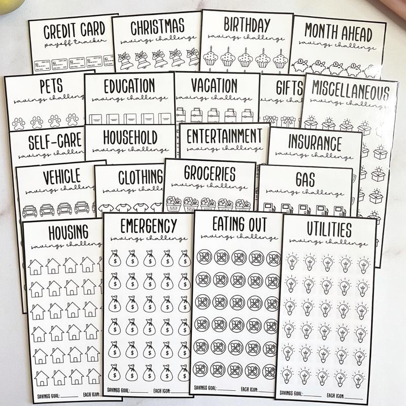 This is a bundle of 21 Laminated Sinking Fund Savings Challenge Trackers in size 3"x6" (Trackers only) - You will be able to reuse them as many times as you like!
