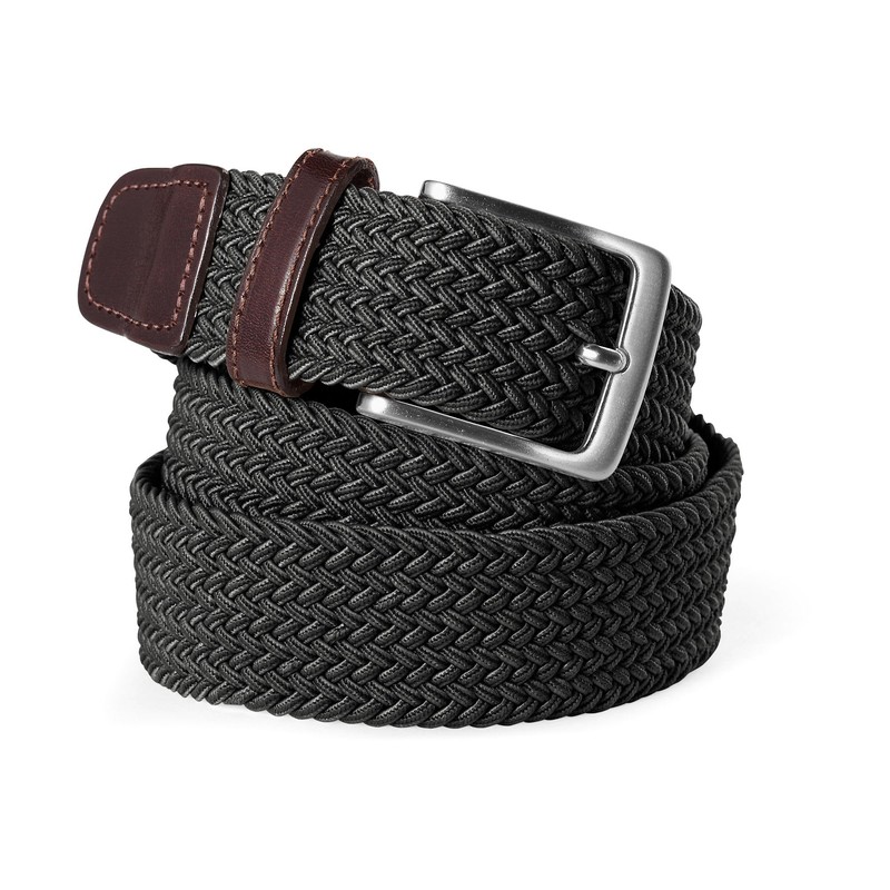 An attractive braided strap made from bungee cording gives you twice as much to love about this belt: it's a good-looking addition to casual outfits and it's high on comfort. The bungee cording gives the belt essential stretch that lets you move more freely than rigid dress belts. And the smooth grain leather trim is a handsome accent.