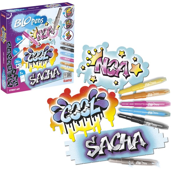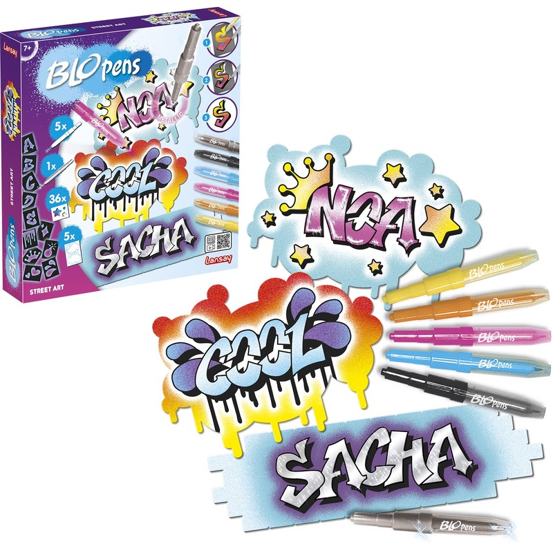- Contents: 6 blopens including 1 glitter blopen, 32 stencils with letters/characters, 5 sheets of stickers, 5 sheets of drawing paper