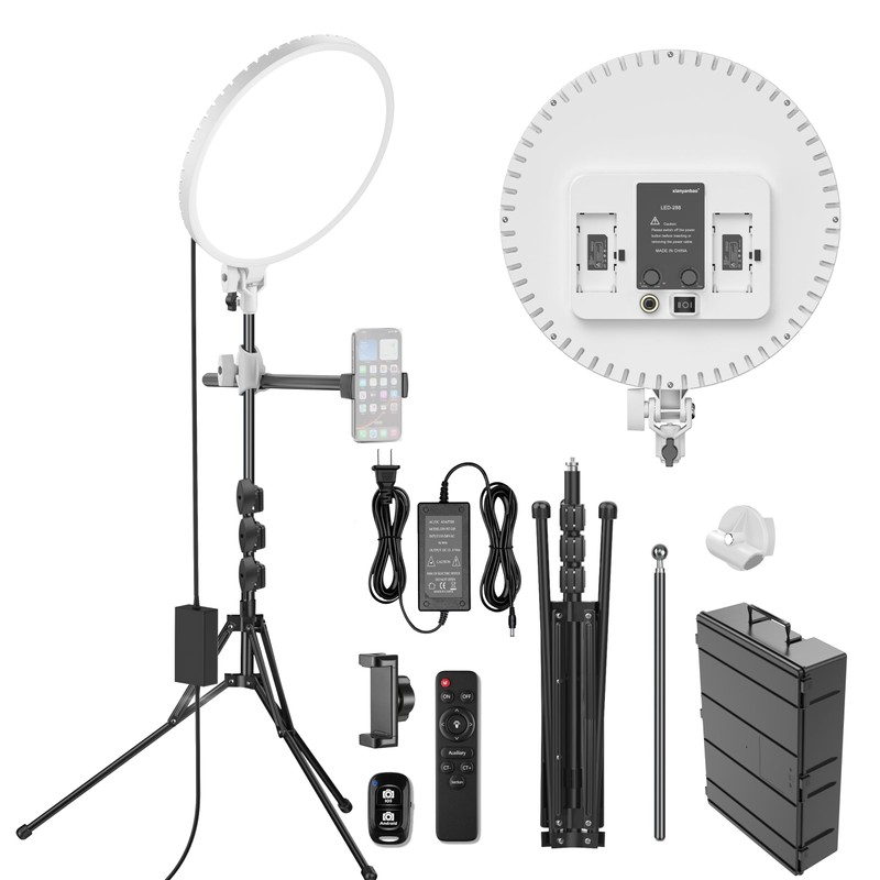 - 【What Your Get】-Packing List: 1*large ring light, 1* ring light tripod stand, 1* light controller, 1*wireless remote, 1* 360° Rotatable Phone Holder, 1*DC adapter, 1*Instructions,1*High-strength plastic box (for travel and protection of the lamp set)