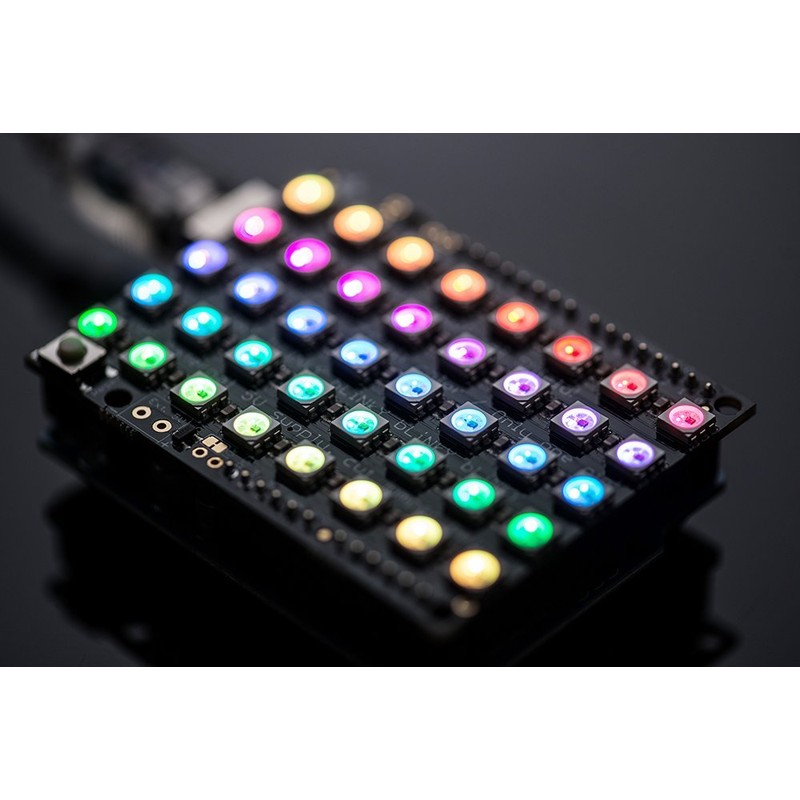 Put on your sunglasses before putting this shield onto your 'duino - 40 eye-blistering RGB LEDs adorn the NeoPixel shield for a blast of configurable color. Arranged in a 5x8 matrix, each pixel is individually addressable. Only one pin (Digital #6) is required to control all the LEDs. You can cut a trace and use nearly any other pin if you need some customization.