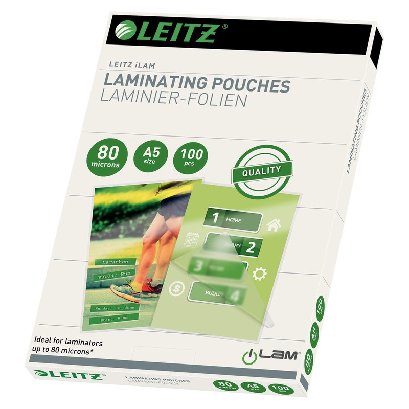 - Clear pocket for laminators, 80 Micron for A5 - made of ethylene-vinyl acetate (EVA) - format: 154 x 216 mm - Content: 100 Pieces