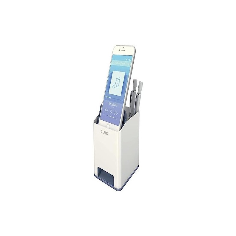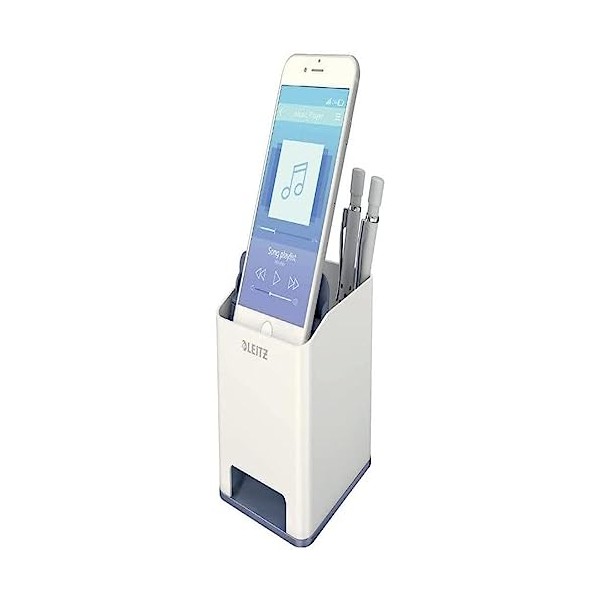 - Box contents: Leitz Wow sound pencil holder with sound amplification function. Colour: Pearl white/black.