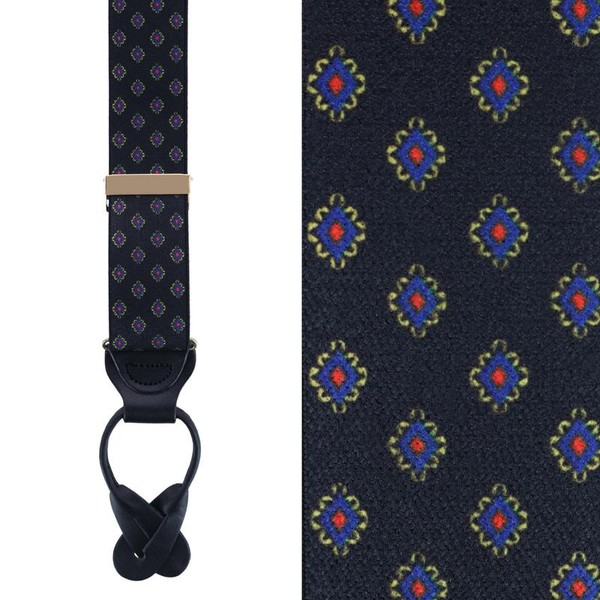 Elevate your style with the Luxe Diamond Print Elastic Button End Braces. These suspenders exude sophistication with their classic diamond pattern, making them the perfect accessory for suits, tuxedos, or even a stylish pair of jeans. The elastic back strap ensures all-day comfort and mobility, while the adjustable design accommodates waist sizes up to 46 inches. Whether it's Father's Day, graduation, or a birthday, these braces make an excellent gift. Upgrade your look and embrace timeless elegance with these luxurious suspenders.