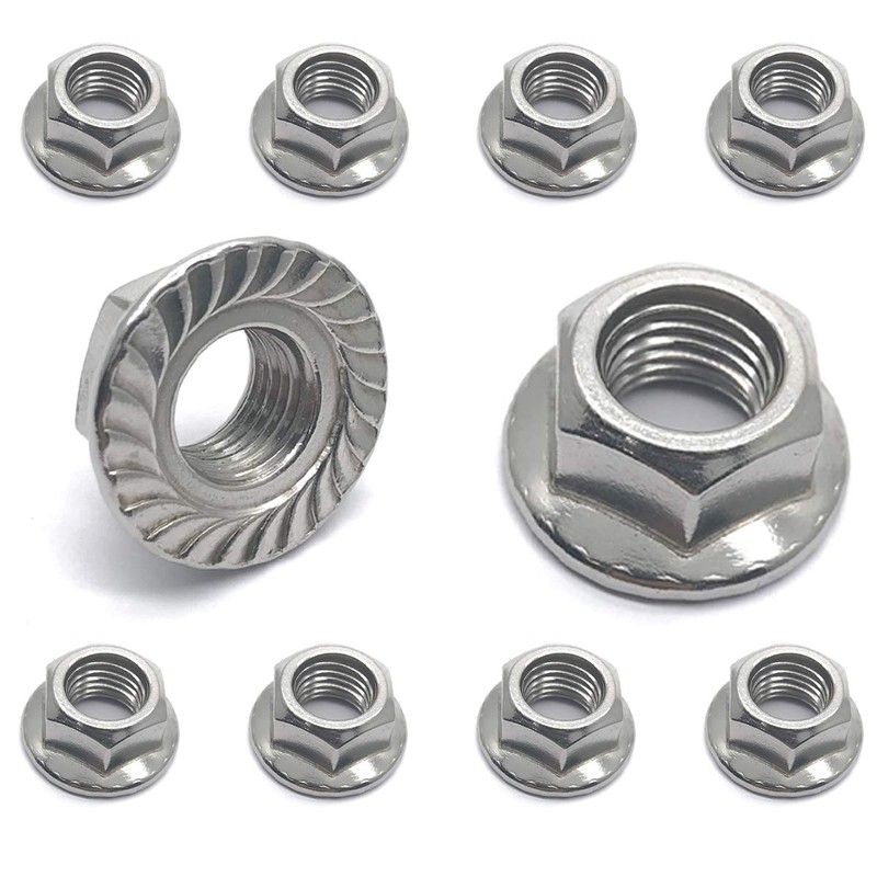 **【Specifications】** \- Quality: 10 Pcs \- Color: Silver tone \- Washer Type: Flat Washers \- Material: Stainless Steel \- Sizes: M16 \- Nuts Type: Hex Serrated Flange Nut **【Features】** \- Stainless steel with rust resistant galvanized finish to ensure life-time use, these quality assortment Hex Flange Nuts for use \- Flanged Nut serves to distribute the pressure of the Nut over the part being secured, reducing the chance of damage to the part and making it less likely to loosen as a result of an uneven fastening surface \- The flange may be serrated to provide a locking action. \- The serrations are angled such that they keep the nut from rotating in the direction that would loosen the nut. \- Because of the serrations they cannot be used with a washer or on surfaces that cannot be scratched. \- The serrations help in avoiding vibration of nut and increase the holding power of nut Warning: the product are small parts, keep away from children and kids.