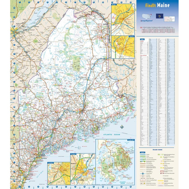 - An up-to-date inset of Acadia National Park provides must-see information on this tourist area. County and city indices make it simple to locate even the smallest town.