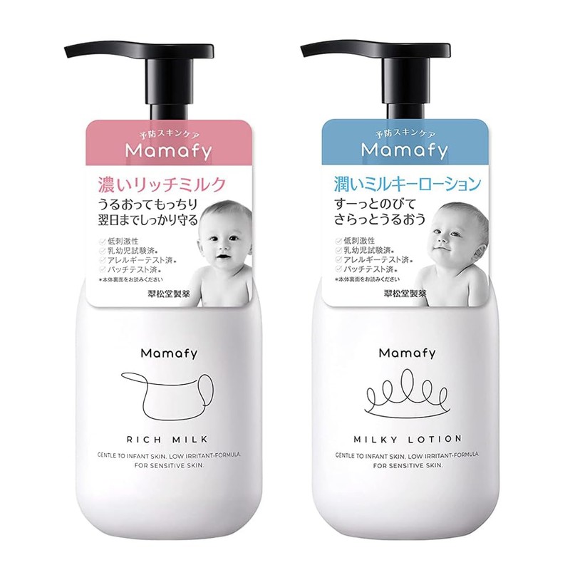 Mamafy (ママフィ) 試せる 保湿剤2種セット(濃いリッチミルク 150g + 潤いミルキーローション 150ml) 乳液 ベビーローション(もっちり とてもしっとり 高保湿/さらっとしっとり 保湿) べたつかない のびが良い スキンケア 赤ちゃん用 (無添加/低刺激性/無香料) 敏感肌