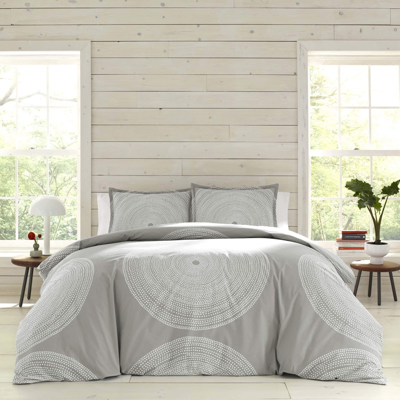 Bring new life to your bedding ensemble with a new comforter set from Marimekko. The Fokus Grey Comforter Set features concentric rings of small white dots which join to form larger circles on a medium grey ground, creating a timeless graphic that looks as modern today as it did when it was originally designed in 1999. The engineered placement of the pattern on the comforter as well as on the shams forms a pleasing, balanced composition that is bold yet serene in its simplicity. This set is constructed with 100% cotton and the comforter features a polyester fill. Included shams feature an easy overlap closure. Set is machine washable for easy care. Twin comforter set includes: One comforter (86"L x 68"W) and one sham (21"L x 27"W). Full/Queen comforter set includes: One comforter (96"L x 90"W) and two shams (21"L x 27"W). King comforter set includes: One comforter (96"L x 108"W) and two shams (21"L x 37"W).