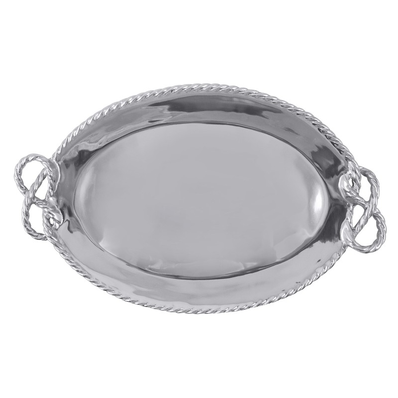 Sailing rope loops around the oval of this serving tray, with figure eight knots forming the handles. Fun and functional! perfect for serving drinks or appetizers on the high seas.