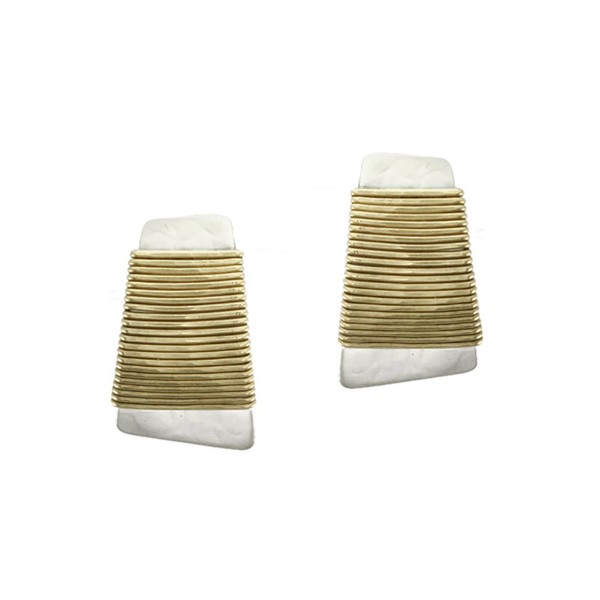 - A sloping tapered rectangle in silver neatly wrapped with brass wire all with a comfortable clip on backing.