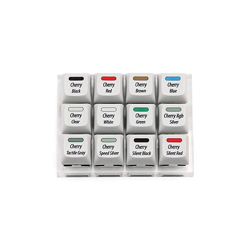- Cherry MX switch type (Qty:12) [Cherry MX Red(1), MX Black(1), MX Blue(1), MX Brown(1), MX Green(1), MX Grey(1), MX RGB Silver (1) MX Clear(1), MX White(1), MX Silent Red(1), MX Silent Black(1), MX Speed Silver(1)]