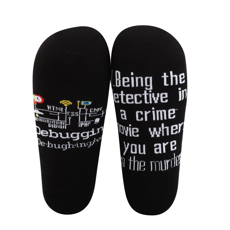 - [PACKAGE&SIZE] 2 Pairs of Debugging Definition Socks Being the detective in a crime movie where you are Also the murderer Socks are packaged in a soft packing bag and ready for gift giving. Socks length*width: 5.3*3.1 inch, fit Unisex Size 4-12. All patterns are sewn on the socks instead of printing, so they won’t peel off.