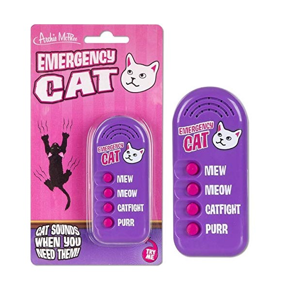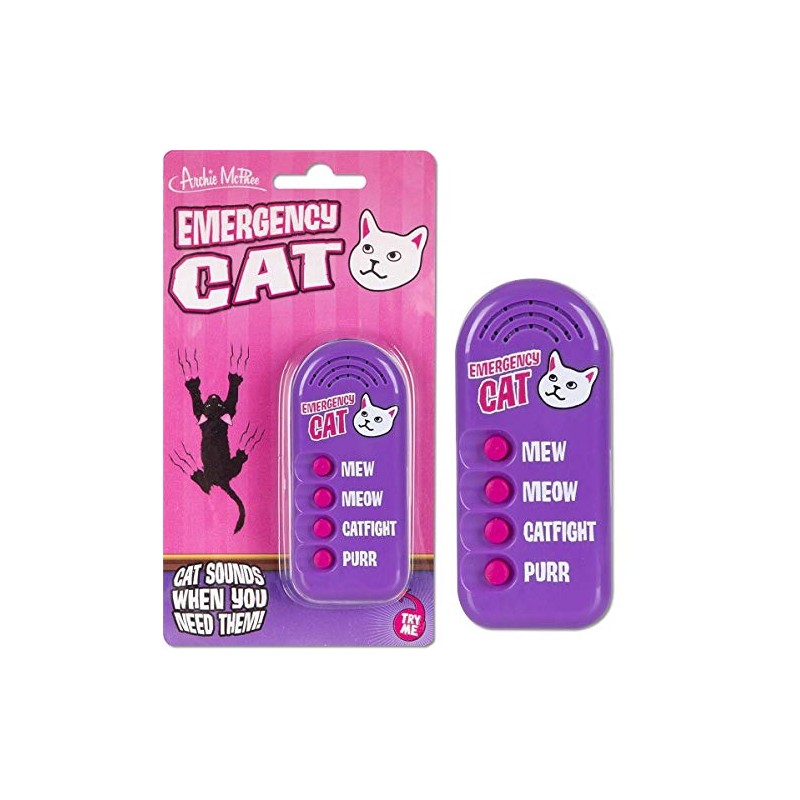 It has always been a dream of mankind to communicate with our cats. This set of four buttons puts us one step closer to a universal cat translator. This 3-1/2" electronic Emergency Cat noisemaker includes four sounds-mew, meow, catfight and purr. Press the buttons whenever you're lonely for your cat or just want to irritate nearby cats. Batteries included.