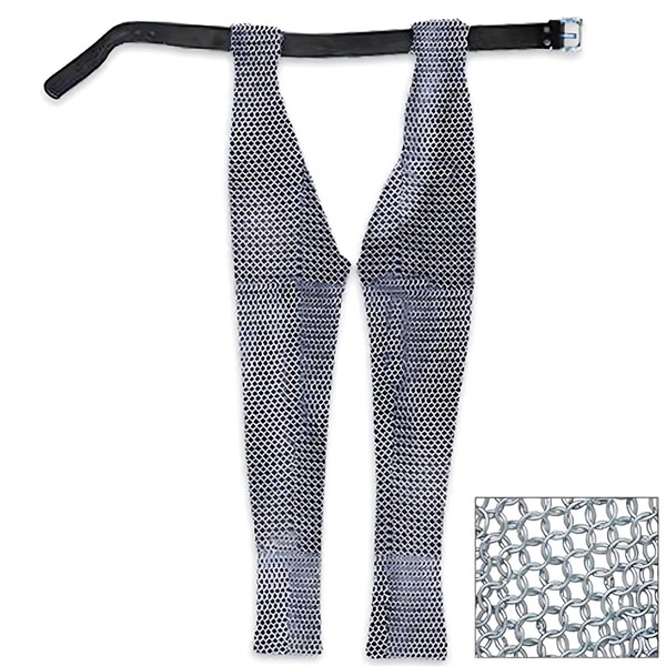 Our Mail Chausses (leggings) are made of butted steel links offer protection for the full leg, front and back. The chausses are designed to hang from a waist belt. The links are 9mm zinc plated mild steel. Overall length is 50 inches.