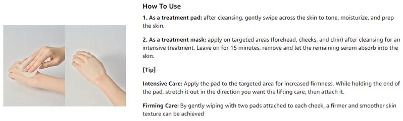 - HOW TO USE: After cleansing, apply on any areas (forehead, cheeks, and chin) for quick and easy intensive skin care. Leave on the skin like a sheet mask! You can also use the pads as a face mask. After using the pads as a sheet mask, gently wipe across the skin to tone, moisturize, and prep the skin.
