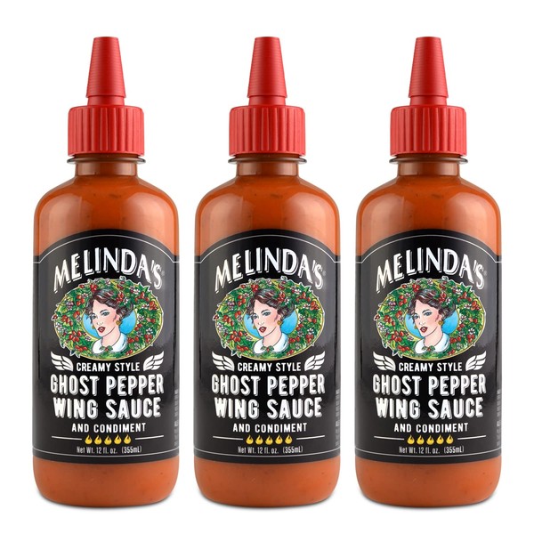 Melinda’s Ghost Pepper Wing Sauce - 12 Oz, 3 Pack - Gourmet Spicy Hot Sauce - Made with Fresh Ingredients, Ghost Peppers (Bhut Jolokia), Habanero Pepper, Carrot, Garlic, Lime - Vegan, Gluten Free