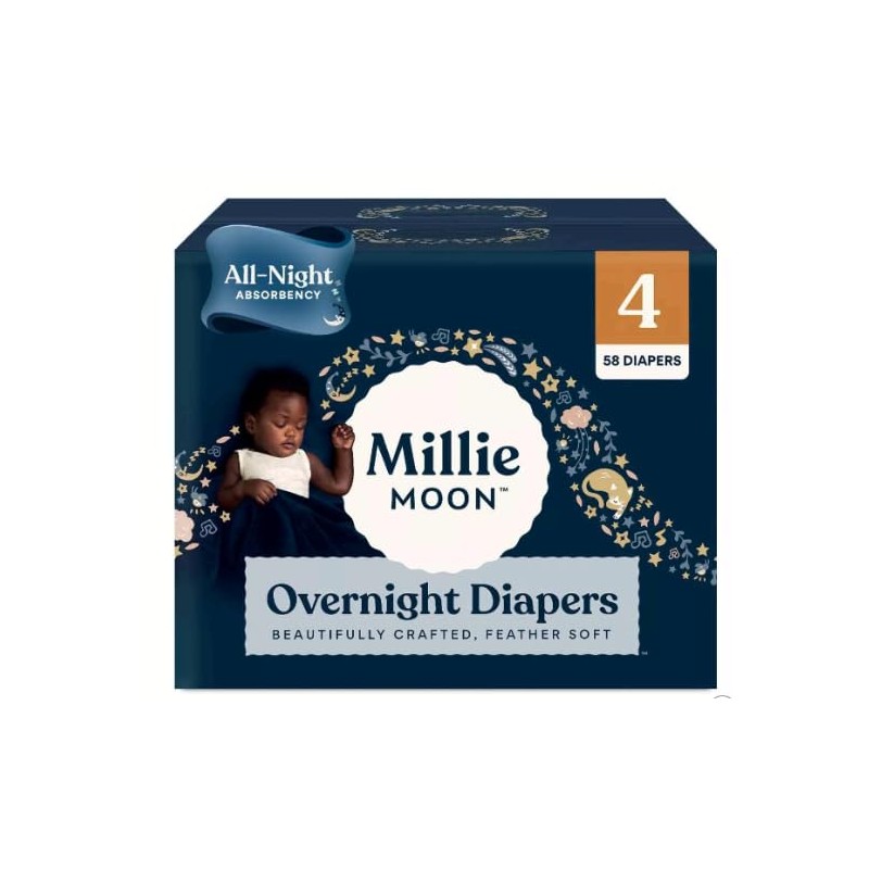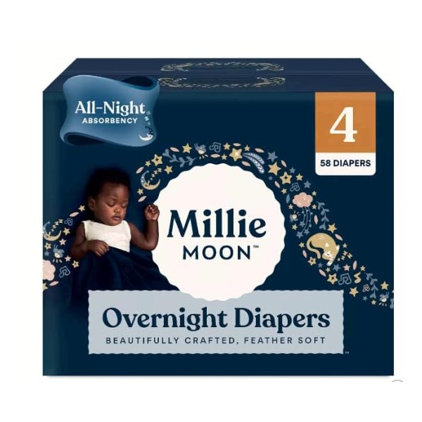 - All-Night Absorbency for over 12 hours of leak protection EverDry Layer to keep delicate skin dry overnight Absorbs up to 15% more liquid than Millie Moon Luxury Diapers CloudTouch Softness for ultimate overnight comfort Our breathable design absorbs in seconds Dermatologically Tested to be gentle on sensitive skin Free from Lotions, Latex, Fragrance and Elemental Chlorine to protect delicate skin Wetness Indicator turns purple when the diaper is full