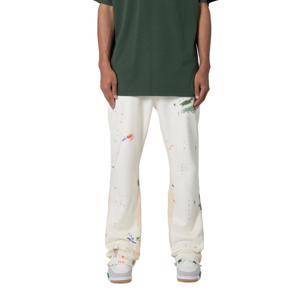 - the Contrast Bootcut Sweatpants are designed with a relaxed fit throughout, featuring an elasticized self waist and leg opening, multi-colored paint splatter throughout, and finished with denim and contrasting panels at the inseam and outseam to provide a flare at the leg opening.