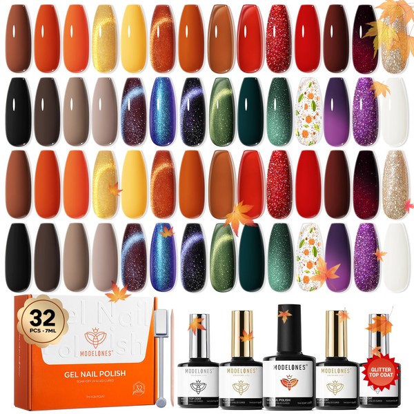 modelones 32 PCS Fall Gel Nail Polish Kit, 28 Colors Cat Eye Glitter Brown Red Orange Gel Polish with Base Coat, Glitter & Glossy & Matte Top Coat Soak Off LED Nail Art Kit Salon at Home
