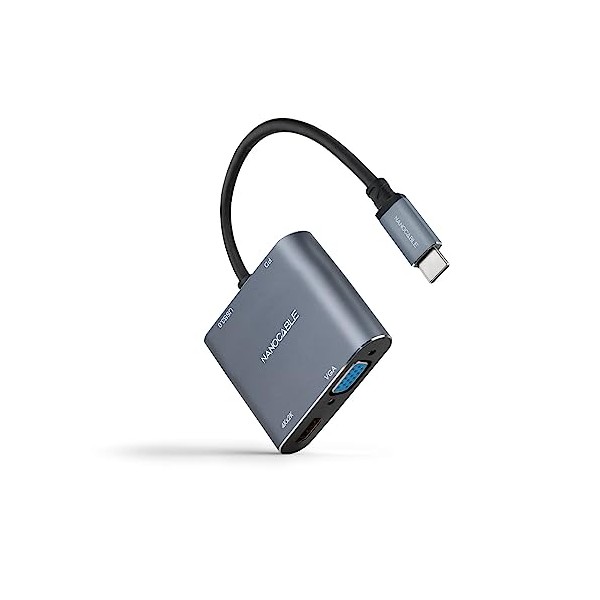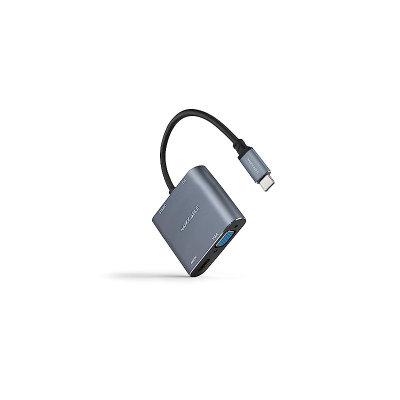 - NANOCABLE USB-C Male to HDMI Female, VGA Female, USB 3.0 and USB-C PD: Highly functional and versatile adapter, allows you to connect any USB-C device to a variety of devices and peripherals, as easy as plugging in the cable thanks to plug and play. All HDMI, VGA, USB 3.0 and USB-C PD ports can work simultaneously, providing greater flexibility when connecting and using multiple devices.