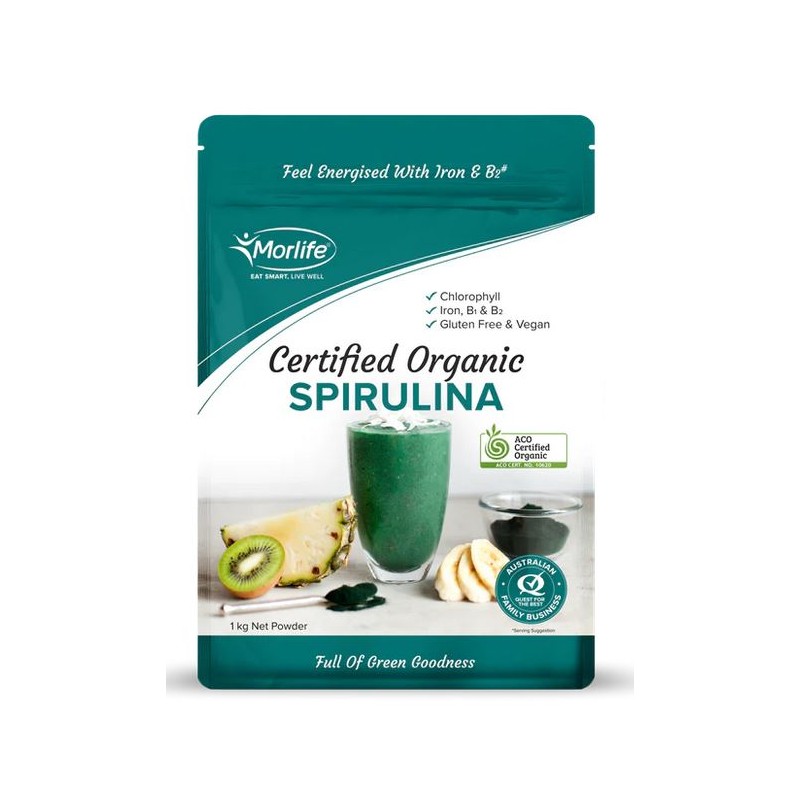 Free from artificial colours, flavours, preservatives and sweeteners, Morlife’s Certified Organic Spirulina Powder is 100% pure. Give your next snack or meal a super boost by adding Certified Organic Spirulina to juices, smoothies, salad dressings or other foods.