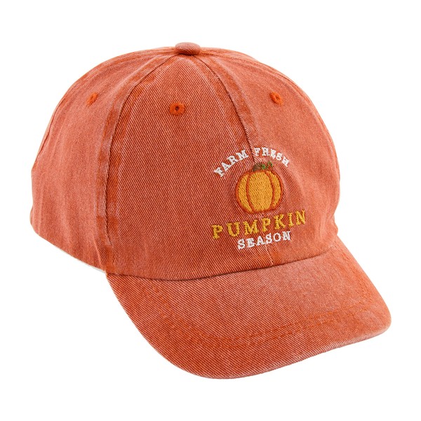 - The front of the hat features a pumpkin image. The hat features the sentiment "Farm Fresh Pumpkin Season".
