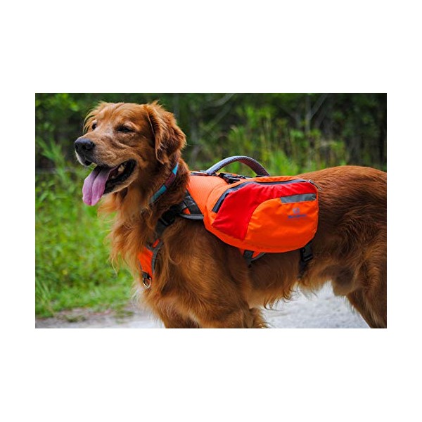 • Lightweight and Comfortable Backpack with Breathable Air Mesh Base Layer. Quick Drying! Size Large Accommodates Medium to Extra Large Dogs. 2 Buckle Release Pouches for Storage for your Pup's Necessities.