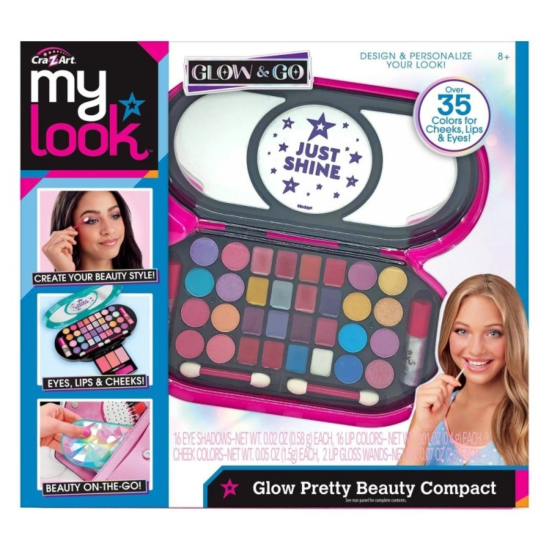 Glow and go with the My Look Makeup Compact! This trendy, gem-shaped compact features over 34 shades of makeup for eyes, cheeks, and lips, with a stylish combination of matte and shimmer colors to mix and match. The compact also includes lip gloss, applicators, and a secret slide-out tray with blush, bronzer, and highlighter for all your beauty needs in one place. With its slim, long oval shape and tri-view mirror, the My Look Makeup Compact easily fits into bags, pockets, and backpacks, making it perfect for beauty on the go. Whether you?re headed to a party or just want to touch up your look, this compact has you covered with everything you need for a flawless finish!