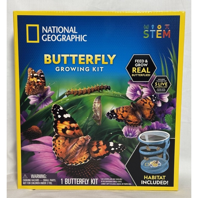 This item is a New in box National Geographic Butterfly Growing Kit. The kit includes a butterfly habitat, a voucher for 5 live caterpillars, a flower shaped butterfly feeder dish with sponge. Also includes a full instruction booklet and butterfly poster. Fast free shipping!
