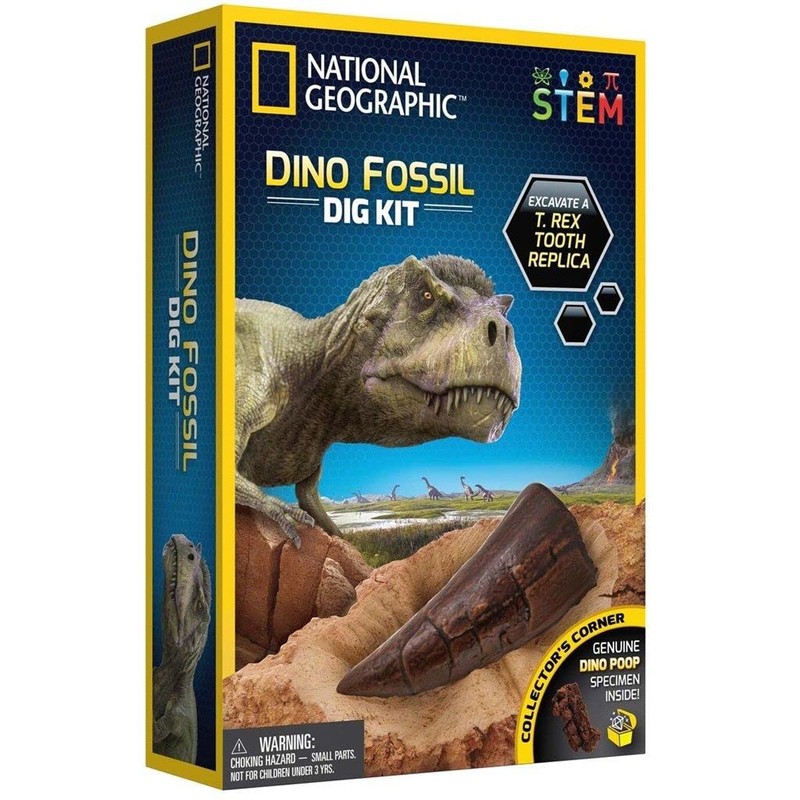 National Geographic Toys makes the highest quality hands-on science toys, and all products are backed by exceptional service. Characteristics:REAL DINOSAUR FOSSILS - Kids will discover 3 real dinosaur fossils! Dig up a dinosaur bone, mosasaur tooth, and dinosaur poop for your rock collection Size: 9.25 X 6.25 inches Ages 8+ The National Geographic Dino Fossil Dig Kitis part of our Friends of Safari - Shop For a Cause collection.