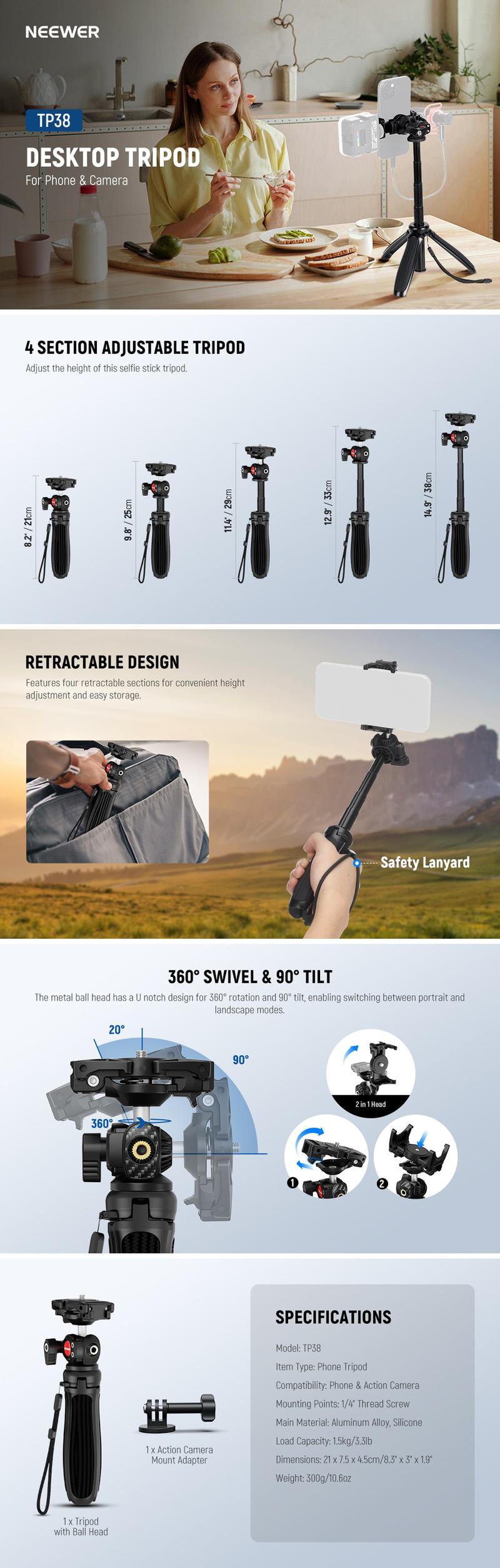 - Tripod for Most Phones & Cameras- NEEWER TP38 Cell Phone Tripod comes with a phone holder can be adjusted from 2.4"/60mm to 3.4"/86mm, compatible with iPhone Samsung and other smartphones. This mini portable travel tripod also supports DSLR mirrorless cameras through 1/4" thread screw. With a tripod mount adapter accessory for action cameras, it is compatible with GoPro Hero 13 12 11 10 9 8 7 Black go pro Max Insta360 ONE X3 X2 GO3 GO2 insta 360 Ace Pro DJI Osmo Action 5 pro 4 3 2, etc