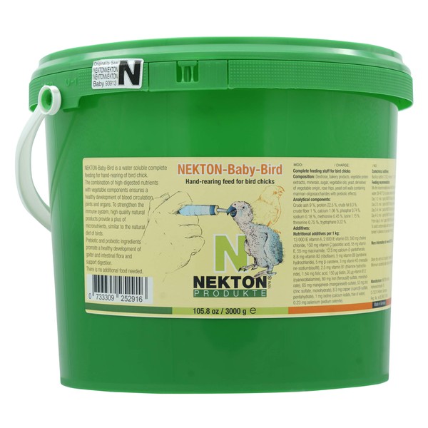 Nekton-Baby-Bird is a complete diet for hand-feeding baby birds. It has been carefully formulated with significant amounts of vegetable based nutrients, ensuring proper development of the circulatory system, internal organs, immune system, and joints. Probiotics and prebiotic nutrients are present to promote the development of healthy flora in the crop and intestines, as well as aiding in digestion. Nekton-Baby-Bird should be fed from day one until bird is weaned; no other food is necessary