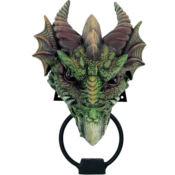 This stylish Door Knocker would make the perfect statement to anyone entering your home. A Green Dragon's face is the main focal point of this piece, green scales cover his features as a pair of thick twisted horns emerge from his skull. His glazed, black eyes add an air of horror to the piece. Cast in the finest resin before being hand-painted, this piece is a great addition to any Gothic home.