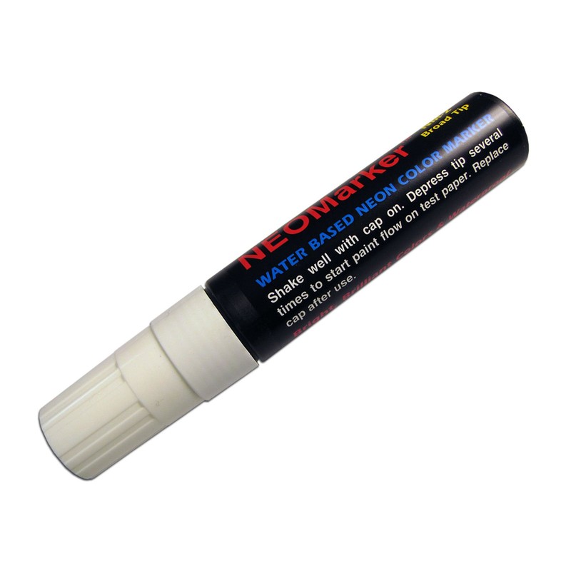 These waterproof neon markers are great as a sign marker, window marker or general glass marker. Writes on nearly anything...GLASS, PLASTIC, METAL, STONE, ACRYLIC, CERAMIC…etc. Stays on in the rain, but easily comes off with most window cleaners. A neon marker with a ½ inch wide tip for bold artwork gives you lots of control.