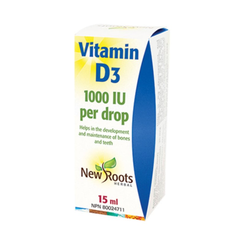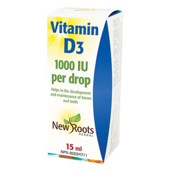 Each drop of New Roots Vitamin D3 contains 1000 IU of this critical vitamin. Vitamin D3 is required for calcium absorption and many metabolic functions.