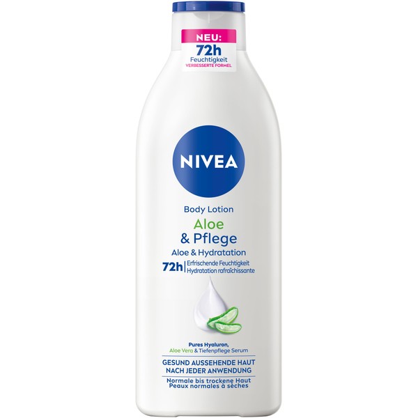 - The NIVEA aloe and care body lotion with pure hyaluron, aloe vera and deep care serum provides 72 hours of intensive moisture; for healthy-looking skin after each use