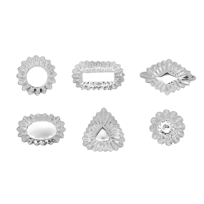 - 6 of each design, all with fluted edges. Round, diamond, oval, rectangle and triangle shapes.