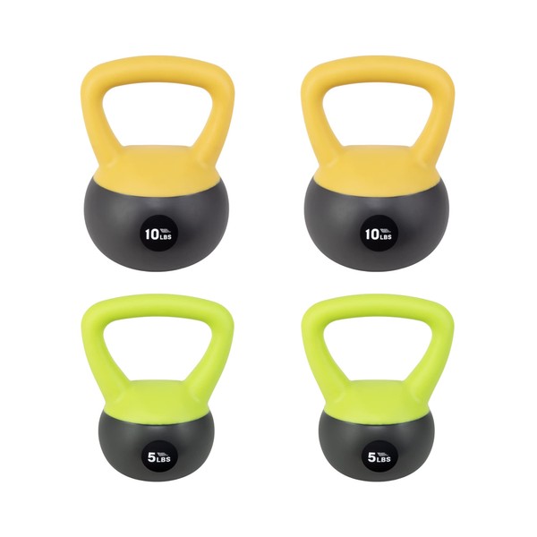 - 4 WEIGHT SET - (2) green 5lb, (2) yellow 10lb soft kettlebells with soft bases & sturdy handles.