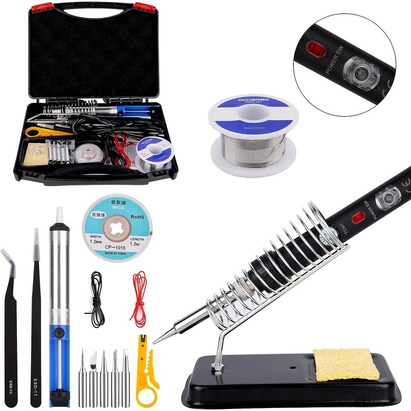 - 18-in-1 soldering kit: Ockred soldering iron kit contains 1 soldering iron, 1 desoldering pump, 5 soldering tips etc., 2 tweezers, 2 electronic wires, 1 soldering wire, 1 desoldering wire, 1 soldering iron stand, 1 soldering iron sponge, 1 wire stripper and 1 carry box. You can take it anywhere and find the tools you need in the carry bag.