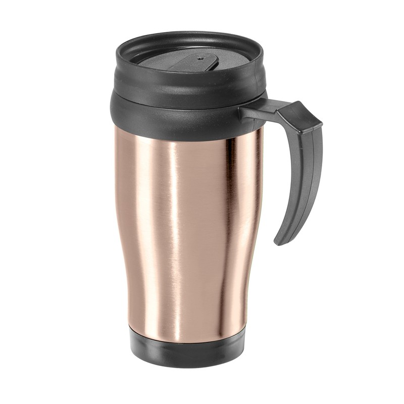 - Stainless steel travel mug with handle, holds up to 14 ounces