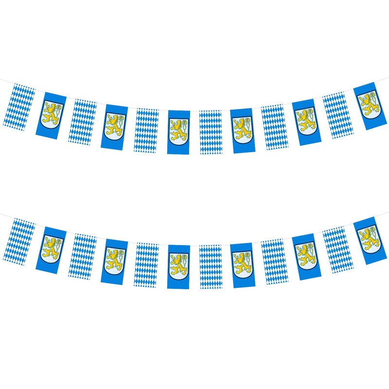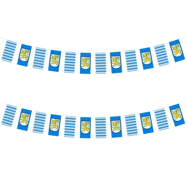 Transform your party room into a festive beer garden with an Oktoberfest Bavarian Flag Pennant Banner. Each of the 12 flag pennants have patterns of the Bavarian crest or blue and white check. Easily hang by the attached strings at your Oktoberfest party!