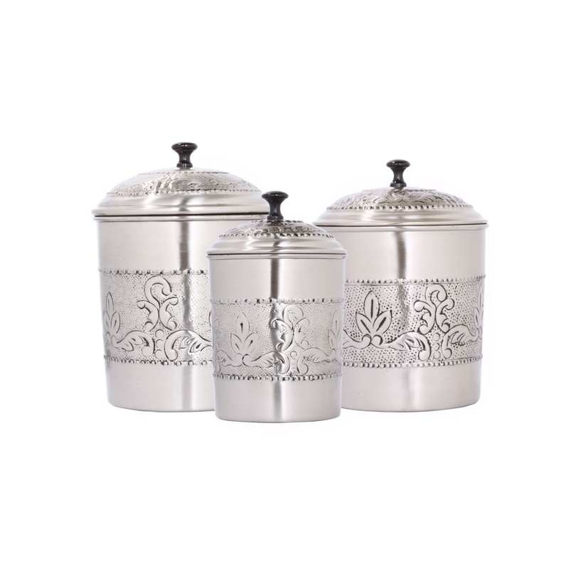 "Victoria" Antique Pewter Canister Set. Plenty of style and storage in this 3 pc. Canister set! Chaised motif is Handcrafted by skilled artisans, making each an original work of art. Steel with a rich antique Pewter finish. Generous 3 Qt, 4 Qt and 5¼ Qt capacities.