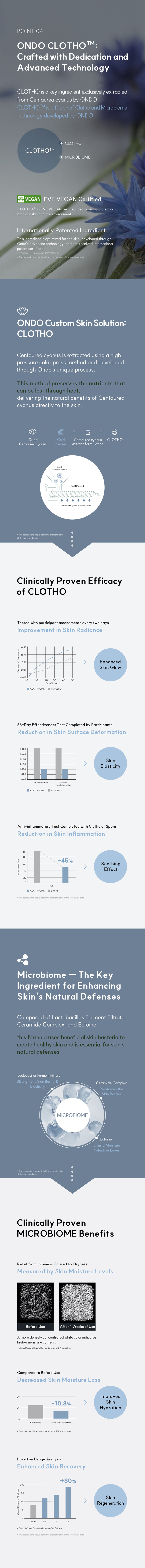 Clotho™: An all-in-one customized ingredient that combines the soothing and revitalizing energy of cornflower extract with a microbiome to promote skin health. Centella Asiatica Extract: Soothes sensitive skin caused by external irritants and helps improve skin regeneration and resilience. Madecassoside: A powerful ingredient for moisturizing and soothing, helping to smooth rough skin. Panthenol: Known as Vitamin B5, it has excellent skin penetration and moisture retention, making it ideal for dry skin. Ceramide NP: Strengthens the skin barrier, protects the skin, and prevents moisture loss, maintaining long-lasting hydration.