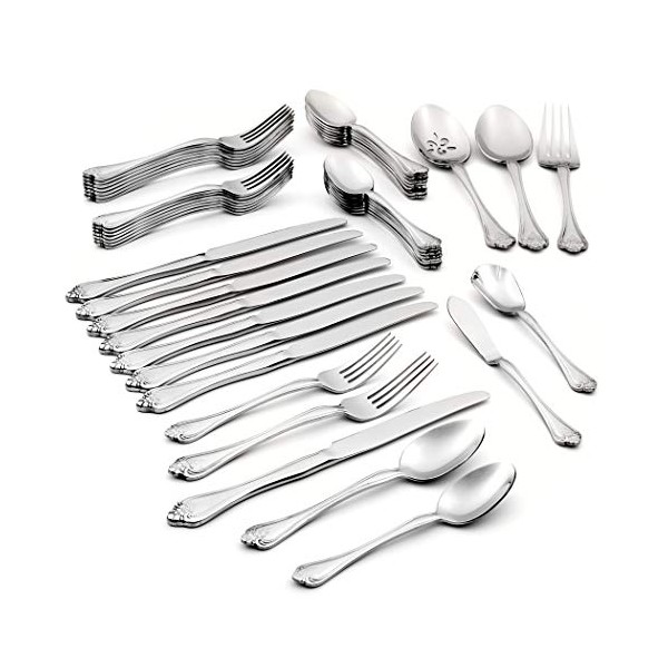 - 20-piece flatware set with service for 4: Set includes 4 each: salad fork, dinner fork, dinner knife, dinner spoon and teaspoon