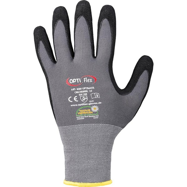 Standard EN 388 - Premium quality - according to Oekotex Standard 100 - Liner in stretch design for a perfect, ergonomic fit, flexibility and wearing comfort - flexible and breathable nitrile/PU coating - back of the hand - thin and therefore light coating, yet good resistance to mechanical stress - very good tactile sensation - fine knit, seamless - secure grip even on smooth objects - good resistance to oils and fats material: carrier 92%. Polyamide (nylon ), 8. % elastane, grey coating nitrile foam with water-based polyurethane, breathable, black. Sizes: 6 - 12